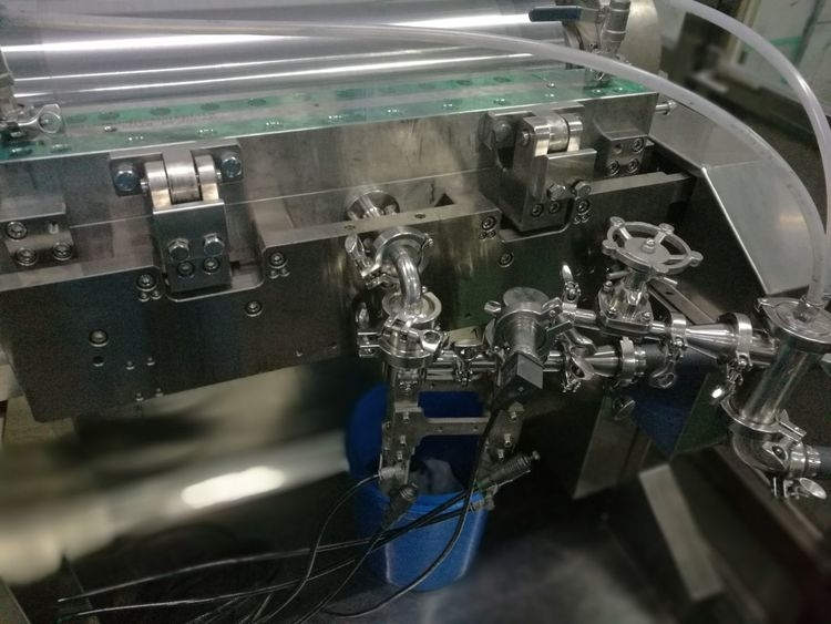 涂布模頭,如上圖所示,箔材經(jīng)過驅(qū)動背輥與擠壓頭之間的間隙繞過背輥向一個方向行進,擠壓頭間歇地向泊材涂覆漿料。頭厚,是因為模頭為了克服漿料的靜磨擦而采用的開始漿料瞬時壓力較高而產(chǎn)生的;拖尾,是漿料涂完后,由于漿料的流涎作用,而產(chǎn)生的涂長在收尾時產(chǎn)生的鋸齒狀的邊緣,為了解決厚頭和拖尾的問題,涂布系統(tǒng)控制方法包括以下步驟在模頭開始向泊材涂覆漿料時,擠壓模頭縫口處的漿料進行倒吸使?jié){料回流;依據(jù)該涂布方法,在開始涂布時,使擠壓頭中漿料在開始供料的瞬間微量回流,減少涂覆于基材上的漿料量,可以有效地控制間歇涂布頭部的厚度;而在間歇時即擠壓頭停止涂布時,同樣使擠壓頭中漿料瞬間回流,使涂覆在基體上的漿料可以迅速斷開,這樣有效地控制間歇時尾部拖尾的整齊度。從調(diào)試過程中結(jié)果來看,這種涂布方法對模頭腔體壓力控制要求非常高,如果控制稍有偏差,不但不能解決頭厚和拖尾的問題,反而還會適得其反。(所以對漿料粘度偏差不能太大)